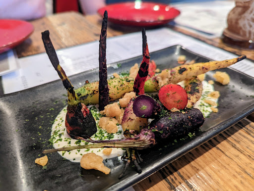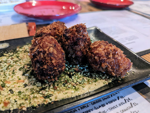The food was amazing. Just stunningly good. The music is loud, but if you can stand it, it is totally worth it. We ended up trying 9 different things and had a blast. The flavors are superbly blended. I would recommend the battleship Curry and the new York strip. The yakitori was perfectly flavored and the fried rice tots were a lot of fun.
