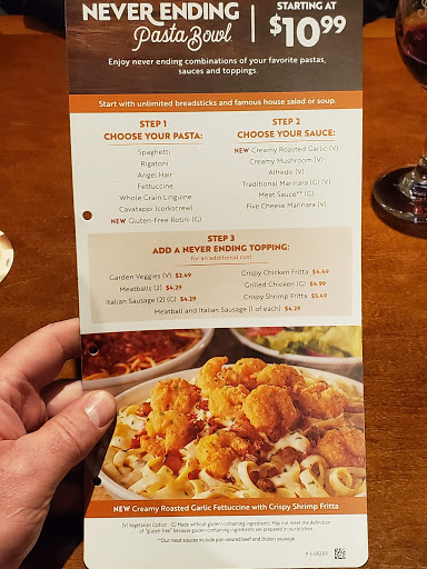 Our experience with Olive Garden has always been great food and great service. But I would like to especially call out, on this review, their community service "awesomeness"! The General Manager was so professional and accommodating when I approached him for a donation for a special senior luncheon at our local high school. Our high schoolers love Olive Garden and were so excited to see that all the breadsticks were donated by them to go with our Italian themed luncheon. It was a big hit and our school is so grateful for Olive Gardens generosity. Thank you Luke, Hannah and your awesome staff!!!