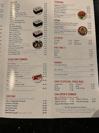 I was very pleased with the food & Hibachi Cook was great. The server was floating around & I always had to Ask for a refill but she always asked the other people sitting at same grill if they needed anything but not me. Also the female manager was rude & horrible! I almost walked out b/c they dont seat parties of 1 at the Hibachi grill. I was like "WHAT?" I was asked to wait at the bar & had to wait 15 minutes until another group of people came in for the hibachi. They didnt offer any discount for my inconvenience. I will be calling the owner because this was totally unacceptable. Ive eaten at hundreds of Hibachi/Sushi Grills & "Never" had this happen. I would return to this restaurant because the food & chef were great. The manager needs to get a reality check & realize there are Party of 1 that enjoy Hibachi Grill Entertainment. The California Rolls for appetizer were good also. My advice is make sure you dont go solo or you might have to wait. It takes about 1-2 hours for dinner so dont plan to run in & eat then leave.