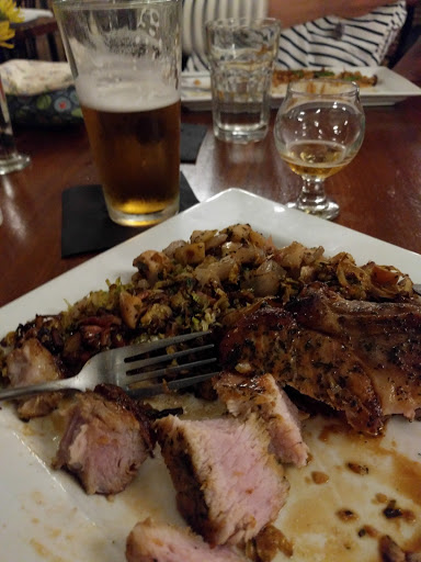 Restaurant and brewery set inside Dovers Cochecho cotton Mill. Large, sprawling 20+ seat bar with shared table seating in parallel. Dining tables in back. Always a diverse selection of in-house brewed beers on tap with a collection of craft cocktails and local spirits. Fixed (doesnt change often) Farm-to-Table inspired menu offering signature burgers, eclectic sandwiches, and hearty entrees - most all made with local meats (not much here for vegetarians, sorry! Even the chocolate cake has bacon!) No TVs, which is truly unheard of in Dover, but is a welcomed omission to the dining atmosphere.