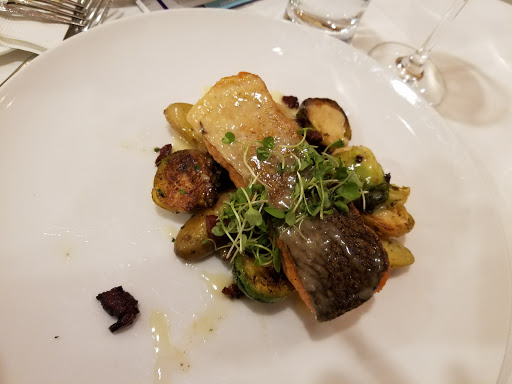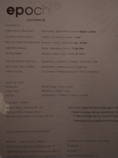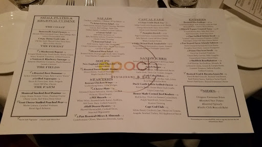 Specializing in fresh local ingredients, Chef Ben Hasty presents New England regional cuisine with current and innovative trends. Everything is always perfectly cooked, perfectly seasoned, and attractive. The price is very reasonable for the portion size and high quality of the ingredients. This is Boston haute cuisine in New Hampshire. Ive been for weekday breakfast, where I had 2 eggs, 3 slices of bacon, and 1 piece of toast that came with a half cup each of seasoned homefries and fresh fruit that included pineapple and berries, not just melon, for $5.99 - this is downright CHEAP for a hotel breakfast! At dinner Ive had homemade duck sausage; baked oysters with fried potato and capers; poached cod; a fabulous wild salmon with grapefruit; delectable pork belly from the chefs familys farm; poached salmon with carrot mousseline and roasted fennel; tuna with Parisienne gnocchi and roasted tomato; scallops with smoked bacon and celery root; duck with braised kale; fallen souffle cake, chocolate chip cookies, coconut rice and mango, and pannecotta for dessert. Apps range from ~$6-13 for soup, salad, and seafood; entrees ~$16 (for chicken, and for risotto) to $36 (for filet). Several entrees (fish and lamb) are available in half portions, and with an appetizer, are more than large enough for your meal. One can get 3 oz or 6 oz glasses of wine - they will bring tastings if you are undecided; the wine cellar is robust and impressive, and there is a full bar. We frequently put ourselves in the chefs hands and just order a 4 or 5 course tasting menu. They are doing 5 courses for $55 for New Years Eve Dec 31, 2009 - that includes a champagne toast - VERY reasonable! The hospitality in the restaurant is gracious and attentive and professional, even during functions. The ambiance would be perfect except for the horrid neon orange stairs that lead to very classic dark wood bar, and some mod light fixtures that need to go.
