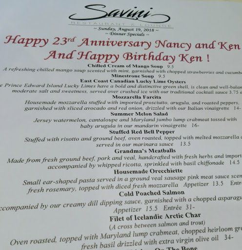 I have been a frequent customer of Savinis for years and each experience exceeds the former. The staff is extremely congenial and accommodating. The food is consistently excellent and the service impeccable. On many occasions when I have a special celebratory event, Savins is the place I choose without hesitation. I was there last night, celebrating a birthday for a friend.. A special menu with her name was printed ..and we were given such courteous treatment.. I rate Savinis the highest score!