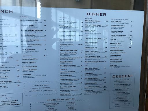 Went for dinner 9/17: PROS: -the decor/vibe if you are in the main room (not the sides) -edamame ravioli is very tasty CONS -Service was awful -Went the whole meal with no water refill -Waiter never even took my empty alcohol glass and didnt even ask if I wanted anything else -Took forever to try to get waiters attention that we just want water and the bill. -The vegetable Broccoli side was SOOOOO SALTY and OILY. so gross. -Everything on the menu is suppperrr oily -Mushroom Potstickers were super oily and lacked seasoning so you had to dunk them into the sauce repeatedly with every bite -I had Wasabi Crusted Filet Mignon $39. The wasabi crust was basically butter soaked crumbs with wasabi flavor...the super oily crust took away from the great cut of meat -I had the "Serenity" alcoholic beverage and it was basically juice; wasnt even sure if they added any sake at all.