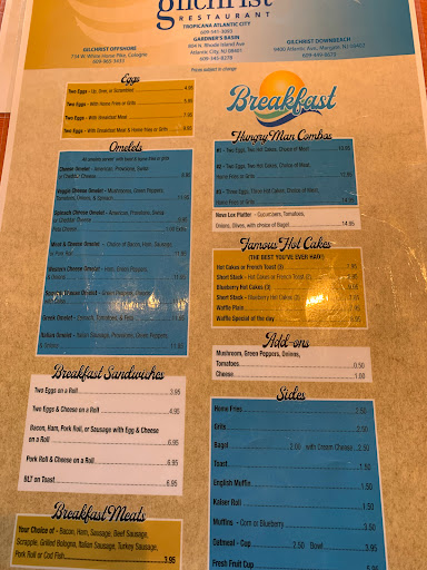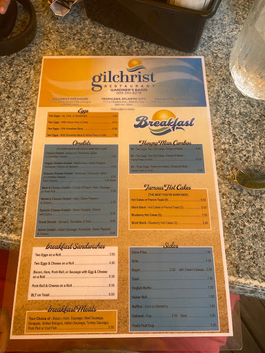 Great breakfast and great atmosphere on the outside covered deck that sits right on the water. A real Atlantic City gem. No matter what you get to eat, order at least one pancake to try. They are excellent pancakes; traditional and thick but not too heavy. Just perfect everytime . Get there early on the weekends to avoid a long wait. Even the long wait always seems to go quick. If you are there after 11:00am and there is a log wait then I suggest walking over to Scales to grab a bloody mary or mimosa. That will certainly make the time go by. Gilchrist allows well behaved dogs on the deck. There is not a ton of room so larger dogs will be cramped during peak times.