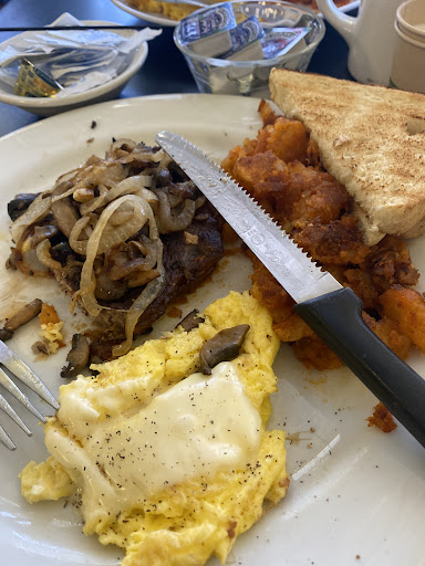 The food was nasty. My waffle was so tough theknife barley cut through it, the homefries were undercooked, eggs werent scrambled they were fried apparently thats how they do theirs