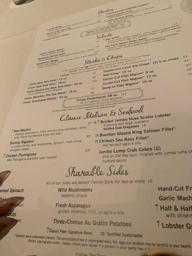 They are very overpriced for average food. They hardly seasoned the meat, then cooked it wrong. I will say, the service was excellent. We had two servers, plus two managers checked our table to see why we were unhappy, then did their best to fix it.My advice - go to your favorite restaurant 3 times instead of dining at The Palm once, it will cost the same.