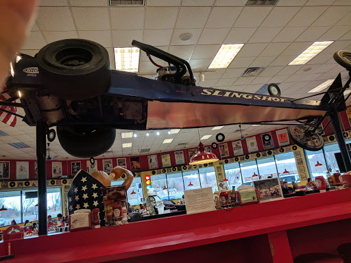 This place has easily the potential of a 5 star review and experience. The theme of this place is phenomenal!!! The food is decent when you actually get it. The wait staff for me has been kids that make a lot of mistakes and are very slow. Summer Saturday nights they have cruise in nights but they put QQs around the building and the modern muscle to the grass. Thumbs down to that because if the car is a rust bucket but has QQs they can park in the lot. So that keeps a lot of the modern muscle guys away.