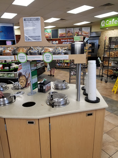 Has an ATM. Seating area with tables and high stools Always clean. Soups are pretty good. Coffee area with fresh coffee . Food is fresh and surprisingly good.
