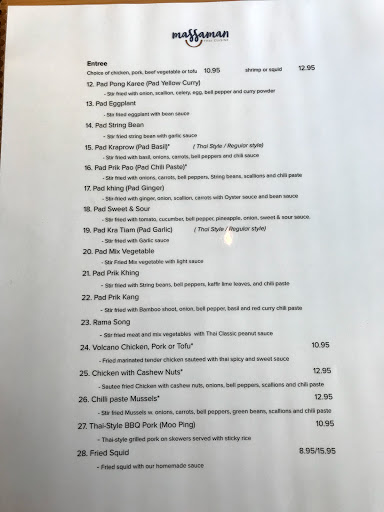 My husband and I went with my sister from Georgia to Massaman Thai Cuisine last night. We had a great meal I had the Pad Thai, my husband had Massaman Curry with pork and my sister had Drunken Noodle. We were very pleased with the food and with the service it was great. Massaman Thai Cuisine has quickly become our go to place as we have dine there on several occasions.