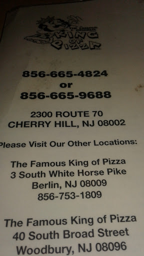 My boyfriend, my sister and I were in the dc, philadelphia and jersey area. We were looking to try any and all new foods. My boyfriend loves pizza and trys it every trip we go on around the u.s. He and I LOVED the pizza from king of pizza in cherry hill, nj. Original and thick crust, both large pizzas. Well worth the money. Staff was very friendly also. Much to choose from also. Chicken salad, sandwichs and etc. If and when i go back to jersey.... I WILL be crossing the bridge to head to king of pizza.
