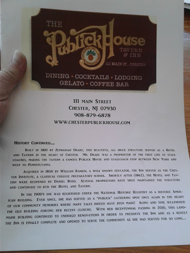 My husband and I had a lovely experience here. We were passing through the town of Chester on our way to a strawberry farm. We had to come back because the town looked to be very quaint and a nice place to walk around. The hostesses were both very nice, and gladly let us sit outside on the porch. It is a nice and comfortable view of their little main street. Our waitress was what made our experience the best. I cant remember her name, but she is originally from Minnesota (we were visiting from WI) and we had a lot in common. She told us about the restaurant and gave us post cards with its history on them. Because we are temporarily in NJ for the summer, she introduced us to some of their local beers. She checked on us regularly, and was all about having some conversations with us. She genuinely was there to give us a great experience. She was also very nice to the table behind us with kids. We give her a thumbs up on making our visit wonderful! We both enjoyed every bit of our food. We each got a salad, butternut squash soup, and mozzarella/basil appetizer. Exceptional food that is well worth the price, and it looked pretty too. If youre passing through quaint little Chester, we would suggest making a stop here!