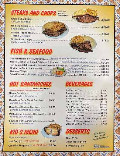 We visited recently for dinner. our party of 5 was seated and given menus. After a wait we placed our orders and they came out in about 15 minutes. We had the sauteed pork cubes with seafood 14.00, others in our group had the combo (half-chicken and half-ribs) for 13.00. Service was fair, we didnt want for anything. the menu was small and basic, a few Portugese items, and a few American ones. Mostly meat, but not as much seafood as Id like. prices were standard compared to what else ive looked at. The restaurant itself isnt that large, there are many tables and booths squeezed together, theres a bar, with about 6 seats and a small deck with tables outside. A desert case rounded out the restaurant. There wasnt anything special about the decorations, there was a map of portugal and a few other things. The portugese bbq places have become more and more common in the last few years. We decided to go here instead of driving up to the Ironbound. The food was so incredible, we had leftovers for the next 2 days. Id suggest plate sharing if you go here.