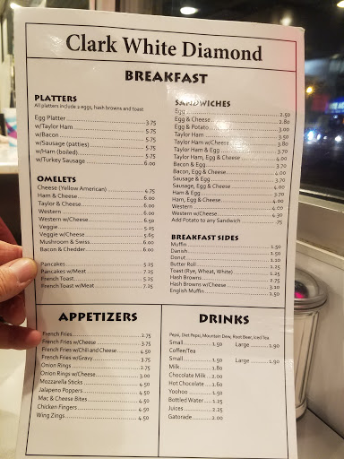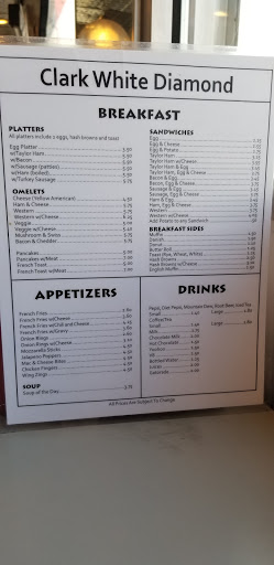 Just went to White Diamond in Clark--Usually Im happy--Today--Every table was filthy--4 tables--One of the workers was sitting at the counter absorbed with his smart phone--I asked him for a rag to clean a table so I could sit down with my wife--He handed me the rag and sat back down with his smart phone--Didnt offer to clean my table or notice the other tables were still filthy---After sitting there for quite some time--We decided to leave because the waitress didnt even say --"Ill be with you shortly"--even though there were hardly any people there----But as we walked out was perfectly able to say--"Have a nice day"--Also--there was no soap in the womens bathroom which doesnt bode well if you want to believe the employees wash their hands well. All my experiences were ok there until today--But now I dont know if I will go back there again.