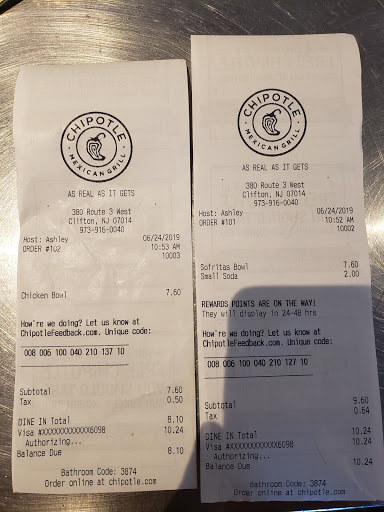 Good chipotle food ohh how I love thee! You can taste the freshness. Clifton location seems to always have long lines, small parking lot and serving portions can be hit or miss depending on timing. I LOVE the staff here. Pretty chill and cool type of vibe. Staff gets 5 stars from me. Just be warned that this location gets mobbed and getting into the parking lot can be tricky thanks to the 4 way stop sign! Theres actually 3 entrances here. 2 on route 3 and 1 in the back on the road that leads you to Costco. If you can stay away from this place during the lunch and dinner rush. The lines get pretty long (although the wait isnt very long) its still a bother to wait for that delicious rice and beans.