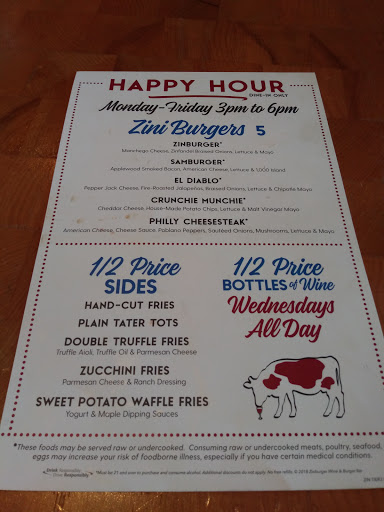 This was my first time at a Zinburger and going into this evening my expectations were high. However my expectations were not nearly met. I ordered the "Zinburger" while it was nice and juicy, it lacked flavors. I could not taste the manchego cheese which is normally, by itself a very strong cheese. The order of loaded fries we received seemed to be very small. And the wine list that is supposed to be the trademark of the Zinburger brand was WAY overpriced for the list they had. There wins consisted of standard 10-17$ bottles of wine which they had priced at $30+ I was not impressed. Lastly there burger menu had no depth to it. They had no Elk patties, Bison... Just beef which, for the high end wine servings burger place this is supposed to be, left me unimpressed.