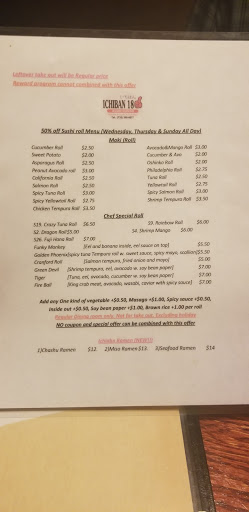 Good (not amazing) sushi, fantastic hibachi. Ichiban 18 has a place in my heart because the people there are warm and friendly, the food is very good, and they have a (small) bar. They have 1/2 price sushi 3 days a week which is a great deal. Hibachi at lunch is also a fantastic deal...I recommend it. Also, the duck roll is fantastic. If they had craft beers on tap, theyd probably earn another star, but right now (and probably forever) they only offer Sapporo on tap. That being said...Im a fan.