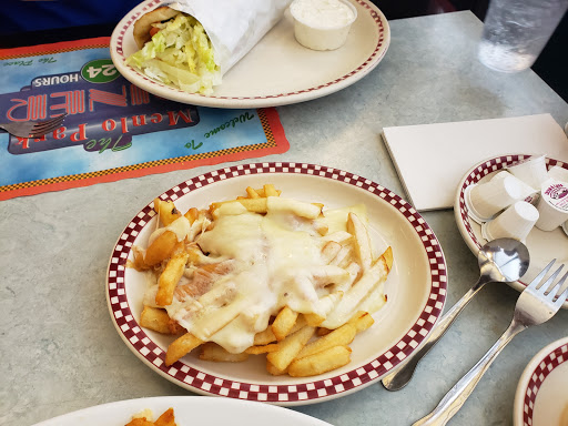 Ive been there 2-3 times. The first time, I did not like it; I was there late on a Sunday night, and the wait staff was on break and I felt like they were ignoring us. The food was not bad. I was pleased with the food, though. We both got burgers, and they were very generously-sized. Further, if you want a rarer meat, they will really give it to you. My burger was quite pink and juicy, and it so large and heavy that you could not pick it up. Lettuce, tomato, and an onion ring were included on it. I couldnt finish mine. The included fries were average, but the portion was generous if you are into that. The second time, we went on a Saturday night at around 7 or 8 -- prime time. The service was much better. We were seated right away despite the absolutely packed parking lot, and our orders were taken: turkey with stuffing for me, pot roast for him. As most diners do, they had the soup-salad-dinner-dessert special. I believe Louis skipped his soup, but I got chicken with matza. It was one single, golfball-sided matza with a very plain, cornbread-like flavor. Our salads were quite fresh, though they used large pieces of a tough tomato that was difficult to cut without making a mess. I absolutely loved my entree. Several slices of turkey, 1/8-1/4th an inch thick, were literally fork tender, covering a brick of tasty, meatless stuffing. Gravy was poured all over the dish, and it tasted canned, but it worked here. I also received a small serving of cranberry sauce that improved the Thanksgiving-esque experience. The mashed potatoes and vegetables were uninspired; the potatoes came to us lukewarm, so it was hard to get a handle on whether they were home-made or not. Louis was less-pleased with his entree, because they interpret their pot roast with a slightly sweet tomato base. It was a little Hungarian in that regard. The meat was also exceptionally tender, but the gravy did not have a beef flavor to it so it is a very subjective dish. You either dont mind tomatoes and beef, or you do. We skipped dessert, because, though our dinners came with it, it was the standard jello-pudding-icecream selection, and our waiter didnt make any indication we could trade up to a premium dessert like cake, which you can do at other diners. Though the desserts in their case looked amazing, they were also sweating a bit. Further, dont try the cookies at the counter. As a note, the man at the cash register will ask you what tip you want to leave if you pay with a credit card, so be prepared to both know it and say it out loud.