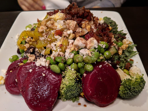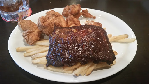 I came here not really expecting too much, just looking for some good BBQ/grill items to satisfy a craving i had. I decided to get the Triple Play dish that contained 4 breaded/fried shrimp, 2 chicken tenders, and a half rack of ribs, with fries. The only good part of the meal were the ribs. The BBQ sauce used for the ribs was the classic sweet and mild flavor that i expected, and the meat was cooked well (nothing special). The shrimp and chicken were overcooked and had no taste by themselves. Not to mention that the 2 chicken tenders were basically bite sized pieces of chicken, closer to a chicken nugget than tender. I couldnt even eat much of the fries since they were loaded with salt, which is too bad because they seemed to be cooked nice crispy. Even though i didnt expect much coming here, i felt like i paid for worse quality food than i could have made using just the oven at home. With so many good places to eat at the mall, i would avoid here unless youre taking advantage of the salad bar or happy hour.