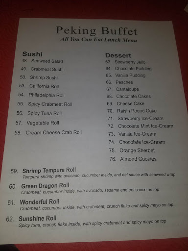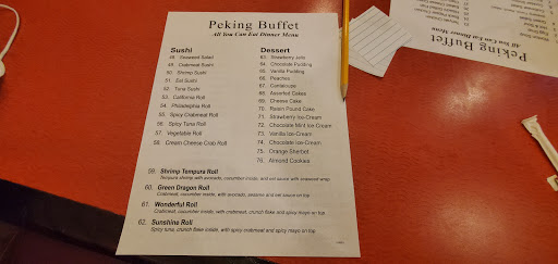 WORST! For the exact same price, go across the street to the Hibachi buffet! Pekings rice rolls/sushi were bland, the buffet selection was minimal and bland as well. The service... bland! Again, you can go across the street and spend the same amount! Their rice rolls/sushi are much better, bigger buffet selection and the service was fantastic! OR, spend a little more and go to Samurai. They are not a buffet but the food is very good!