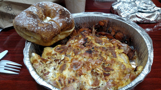 I usually go there super early in the morning for their fresh, fantastic bagels and spreads. I went today, a Saturday, at 10:30, and the owner and two dedicated workers were competing for who was the most awesome and productive worker ever. It was the olympics of one legged men in ass-kicking competition to the death. The line was out the door and they were still cranking out an order every 30 seconds. Just because the line is long isnt reason to leave! Stay and be warmly greeted and well-fed. Cheap in my opinion, too. 2 bucks for a cream cheese bagel! If you read this, go there!