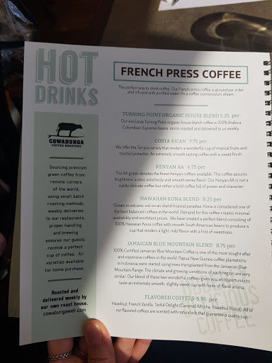 I have been to turning point twice and was very impressed both times. I have ordered two types of french toast and both were delicious. This is also one of the only places I have found that actually squeezes their own orange juice (at $4 a glass though, but well worth it). My father, a coffee connoisseur in his own mind, told me that the coffee was very good. The prices are reasonable, maybe a little expensive, but you get what you pay for. Overall, a great place for a weekend breakfast or brunch.