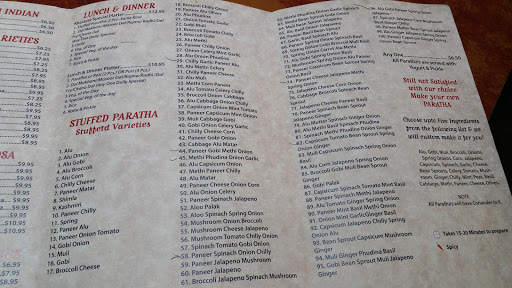 Paratha is good but overpriced. Get the Meal option with 2 parathas of same type and you get 3 currys including chole etc for 13.00. Individual Paratha is 6.50+ default service fee+ tax. Know all this before you go here. Never get the Ice Gola. They sell it for $5.00z definitely not worth it.