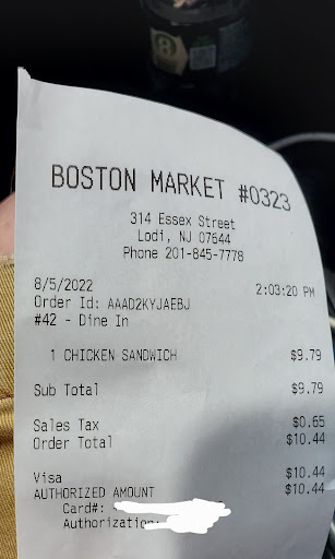 I have a few favorites, but I have to say I have no dislikes. Everything is served by helpful, friendly and kind people. The atmosphere is warm and clean. A well taken care of store. You can tell the manager knows what managing is about because he runs"a tight ship," keeping everything moving in a timely manner. The food is delicious and served hot. The staff is always willing to help. I dine there weekly and have often seen the staff helping people who cant manage. I always recommend Boston Market, Essex St. Lodi, NJ to family, friends and strangers who are looking for a place that serves great food with kindness.