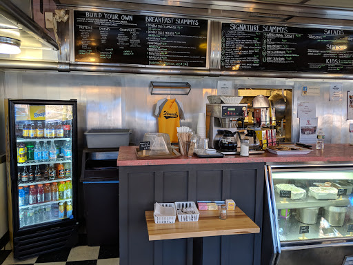 Just had lunch at Slamwich for the second time. The food has been good both times, but greasy, just like the restaurant itself. Its quite a small space and this recent time must have been over 80 degrees, which made me wish I had opted for take-out rather than sit-down. Staff was friendly but overheated. Overall its a good option but I only go when others want to because I dont think its a good value - I think all of the Slamwiches are $9.50 and up, with salads $12-15. They also offer milkshakes but I havent had them so cant vouch.