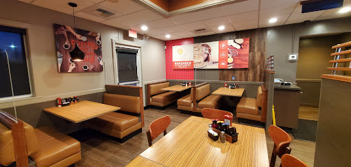 Oddly shaped place, feels crowded constantly. Have to go behind the divide to get to the bathroom. Staff is generally friendly, but always in a hurry. Loud, sound carries. Pretty fast service, food standard.