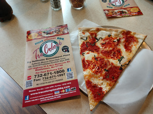 I dont usually leave reviews, but my experience at Tre Colore was too great not to share! My friend and I stopped in for the first time yesterday. I ordered a slice of Buffalo Chicken, my friend a slice of plain, and we both shared barbecue. Not only did the food come out quickly, the woman at the front was very friendly and helpful. She even offered us a sample of their desert pizza, which was also fantastic. Our respective pizza slices were delicious. The ribs were also, surprisingly, succulent and cooked perfectly. To keep this short, Ill be making this my new go-to pizzeria.