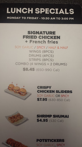 Friendly staff room dining hall but you come here for the chicken and its so worth it crispy fresh to order. soy garlic is a great savory flavor but if you come here looking for some heat theyve got you covered with their spicy flavor.