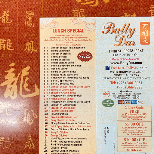 Been ordering Take Out from Bally Dar for Years! Their food is YUMMY! Sweet & Sour Chicken, My husbands favorite, along w/Crispy Egg Rolls! Try their Pan fried Dumplings, too. Im a Fan of Chicken or Shrimp w/ Broccoli in Garlic Sauce! Delicious! Nice guys...great Chinese cuisine!