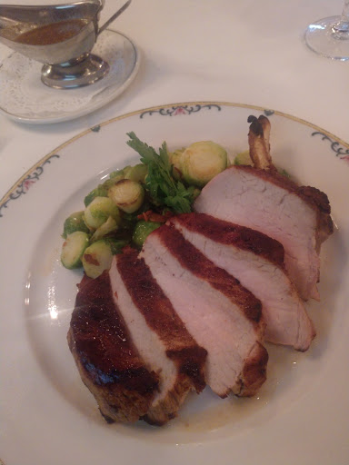 This place is like walking onto the set of Grand Hotel many decades ago. Just darling. It was really cold that night and we asked to sit by the fireplace, glorious. Real roses on all the tables and our servers beautiful French accent added to our experience. :) I wasnt exceptionally hungry so I ordered the Warm Brie Salad. It was excellent! The accompanying dressing was champagne grape vinaigrette. I would buy it by the bottle if I could. My friend ordered the pork chop--a huge portion--and tried a little. It was excellent too.