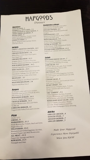 Hapgoods has well prepared, tasty, generous and reasonably priced food mostly light fare from omelettes to hamburgers, wraps and salads, lemonade and ice cream, but some full dinners. Highlights are Truffle Burger or Mediterranean Wrap, both available with a nice side salad or sweet potato fries. Breakfast, lunch or dinner. BYOB.