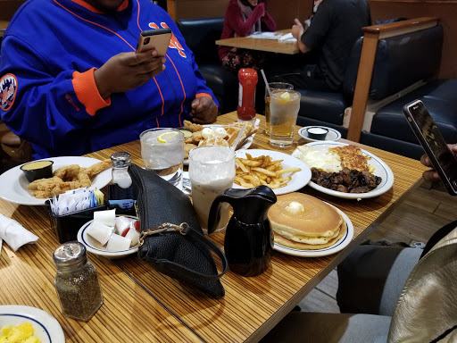 What horrible service. Dirty restaurant. And at the end I paid the whole bill because they were having trouble splitting it. It will be easier to split the bill for us than it would be for them.... Walked in and got seated fairly quickly. Then it took about 20 minutes for them to come and take any orders. They finally came and took food and drink orders at the same time. After they took the orders it took about 15 minutes to bring our drinks and they brought all 11 drinks on a tray and left them on our table to pass out and figure what each one was. The food finally comes but for half the table. The rest was being made. Then all the pancakes were to be right out and it got to the point where we had to ask for them. We never got any refills of any sort even with empty cups sitting in front of us we were never offered a refill. There wasnt any silverware for half our party so when we asked the brought a pile of it and basically dropped it in the middle of the table. When we asked for the pancakes they never brought the guy brought them and literally threw them on the table and they slid across the table on the plates. The whole time we were eating the employees were in the kitchen fighting and cussing because they had to clean the whole place tonight. And one of them was "fin" leaving because he had been there all day. The carpets were so nasty and sticky that walking across them your feet stuck to them and you could hear your feet peeling off the floor as you took another step. It wouldnt have done any good talking to the manager since she was right in the middle of everything and let it go on. She was standing around instead of helping her servers take orders and bring things to the tables or asking if we needed anything. Looking around the restaraunt all the customers looked disgusted with everything as well. I would have expected something more from them since it is located directly across from Rutgers University Hospital. After being at IHOP for 1.5 hrs the woman comes by and asked if we were done and I said yes. We waited for the check to come and never did so we had to get up from the table and start heading to the door for her to finally bring the check. She was struggling with splitting it so I paid for it all so we could get out of there and we could figure it out later. I still left a tip even though I shouldnt have even paid for the meal.