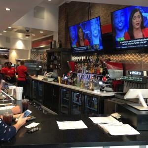 $14 for an overcooked basic cheezburger (i ordered medium well) & a handful of fries. waitress checked on us once...about 30 seconds after we got our food. i had to flag the waitress down to get mayo, refill on beverage and extra sauce...too busy behind the bar talking to "bar regulars" to tend to diners. my sister-in-law got a decent sized chicken sandwich and fries for $10...wish i wouldve gotten it instead of the hockey puck i overpaid for. table had burnt crumbs on it when we sat down that i ended up cleaning off and blaring hip hop music with "f" and "mf" and so on every 30 to 90 seconds...on a devils game nite where kids are eating. i can out curse anyone, but not when i have my wifes 15 year old sister with me. dont think ill ever go back & i frequent the pru center and restaurants before the game!