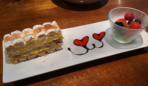 The coffee was good and strong. I like the fact its open late and the desserts are among the best Ive ever had and each desert is accompanied with a cup of fruit. The caramel bread is a must have.