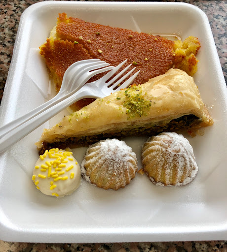 Variety of Middle Eastern pastries freshly made with excellent service and prices period eat in or take out