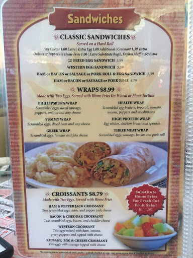 A solid spot to grub when youre unsure of what to eat. This typical Jersey diner has a smorgasbord of menu options from salads to hoagies to entrees. Theres something for everyone in your party. If overwhelmed by options, take the path of least resistance and order breakfast 24/7. A genuine eggs, pork roll, toast and home fries order is a simple, go-to order that time and time again appeases my appetite.