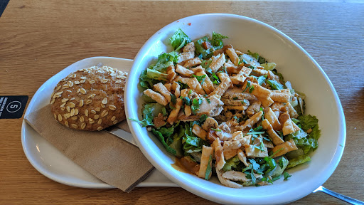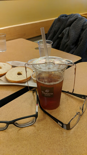 Good Panera restaurant. The menu is good and the food tastes good for the price = good value. This particular location is very busy which is a negative because it can be difficult to find an open table, and not just during the normal lunch & dinner times. There are a lot of people who are working and/or studying at this location and occupy the tables for hours. The restaurant is rectangular and only has windows by the front entrance, so natural light is only found at the front of the store and can be kind of dark & gloomy if sitting in the middle or back of restaurant. The food and price is similar to any other Panera restaurant, so for a quick meal this is a safe place to go, but recommend that you order online or have the food to go.