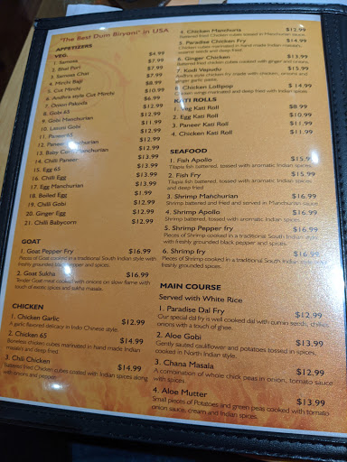 We love paradise biriyani brand but this guy has bad chicken biriyani ! Chicken is over cooked and we orders kofta for the kids and specifically said no spice and it was too spicy ! When I called and gave feedback he was arguing why its not a spicy dish.....we are Indian and eat Indian all the time. Worst paradise franchise !!