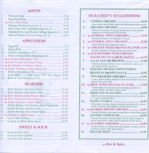 The atmosphere screams "family-run, " and that it is. The food overall is quite good; but if you want to know the best item(s) Ive tried are the Wonton soup, and especially "Moms Dumplings, " Do. Not. Miss. These. Pork Dumplings, some of the best Ive had. The restaurant is very small so no parties of 10. Two or four people at a table. Just come and eat, or get it to go. Thank me later.