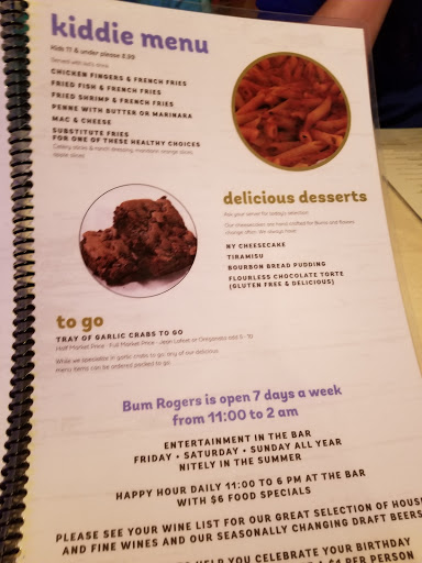 Our family visited on a Monday evening after a day at Island Beach State Park. Had been at the old Bum Rogers a number of years ago and was very unimpressed at that time with everything about it. We then became regulars at the Berkeley Seafood Restaurant which is now gone. So we tried Bums again. This time much was better. It is still a loud bar/pub like atmosphere but the greeter was friendly and the wait time was not too bad although it was a Monday. The interior is small for seating but it definitely looks airier and more inviting post Sandy when it was revamped. The food entrees we had were good. I had the garlic crabs and my son and wife had the roast beef special. Veggies however are one choice, a red skinned potato and a small piece of a corn on the cob which wasnt all that great. There are no free appetizers such as a salad or bread offered. Prices are fairly typical and in line for the shore and the fact this is not a high end restaurant. Service was fairly quick but perfunctory and while the owner checked on us as to how our dinner was immediately after we were served, we had not yet had a chance to eat and were realizing we had not been provided with any forks. The waiter however never checked back with us and earlier while waiting for our dinner had to be reminded to get our drinks. All and all it was okay. We probably will not go back as I can only imagine how long it would take to get in that small place on a weekend when we are normally visiting Island Beach SP and we just were really not all that impressed.