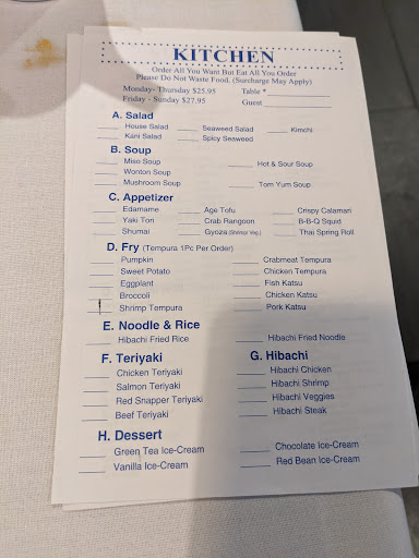 Food is good but not what you would expect for the high price. They have an all you can eat option but it is served on-demand. Order form is provided one each for each order after you finish eating the first order. Each portion is very very small; if you ordered five things on the form youd receive five teeny tiny dishes with tiniest portions possible (except rice) in them. Then you would need to eat it and wait for the form to order more. I thought this was a highly inconvenient way of having a meal. They did not give me an order form after two rounds, although I was told it was all you can eat.