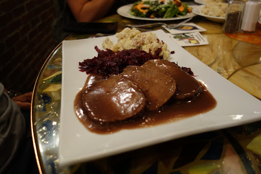 I would never go to the restaurant again. Our waitress (whose name I remember but I will not write on here) was the worst waitress of all time. It was actually comical how bad she was. First she got the drinks wrong, could not remembered who ordered what. Then she dumped a WHOLE full of water all over my father. Literally so bad that they had to get a mopped to clean up the floor.The manager asked if my father was okay but that was it. They did not comp his meal. I think they might have comp him 1 beer but i cannot tell for sure because the waitress screwed up so much that she had remove beers a couple times because its not what we ordered. We sat down at 8 and didnt eat our dinner until 10 at night. We had to tell her twice after getting the appetizers that we were ready for our meal. It was so bad that she would actually argue back what we had order. One of the guys at our table ordered onion soup and got beer cheese and when he told the waitress she said no you ordered this, hes like no i didnt, she goes yes you did and just to make things easy he just stuck with the beer cheese soup. The same situation happened with my friends beer. He was pointing at the menu to say this is what I ordered and this is not what you gave me. I dont only blame the waitress for our terrible experience but the management really should have stepped up and tried to fix the situation. Its unfortunate that that the service was so bad because the food was good (although it was very much over priced) We asked a bartender if this was her first night and he shamefully said no, it wasnt. I will never go to this restaurant again nor recommend it anyone.