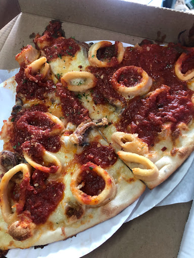 Lots of different kinds of pizza. I usually get them by the slice. Yet sometimes i go to eat there. If going to eat there, Id go on the early-side, because it a small place and can get crowded. Also has a variety of other foods including soups, sandwiches, saladsan various pastas.