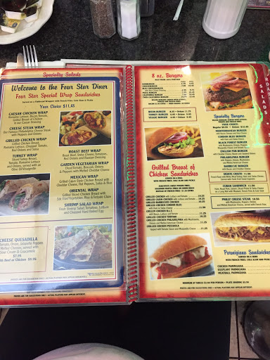 My friend and I have been going for basically all our meals here for quite a long time. I personally love Four Star diner for their reasonably priced food and great service. I especially look forward to the delicious lunch specials. The salad bar is probably their top most specialty, with fresh marinated veggies you can never go wrong with it. The staff is very friendly and offer fairly quick services. You get great foods to pick from their menu. You don’t have to worry about parking space as they have ample parking just outside the diner. You cannot go wrong with Four Star Diner.