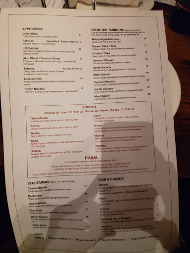 Been here many times. It is always really good, even if its not the cheapest option out there. The curries are great and the meats from the tandoor are delicious. If you want to try more things at once, order a sizzling meat dish from the tandoor and pay the extra $5 for a small bowl of curry, rice, and naan to go with it. Their vindaloo has some great spice. Next time Ill have to try the super hot "phal" curry and see if I live to tell the tale. ;)