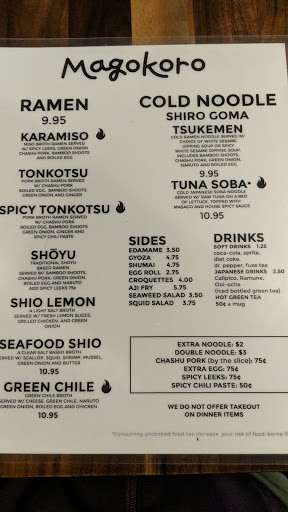 Magokoro is a tiny little restaurant in a strip mall on Menaul just down the road from the mall. Despite its tiny hole-in-the-wall appearance, this place has the best Japanese food in Albuquerque. Magokoro is closed Sundays and Mondays, and the rest of the week its open around noontime for lunch and in the evening for dinner, but closed for a couple hours in between. For lunch, they have a variety of everyday Japanese staples like donburi, curry, tempura, and potato croquettes. I always get some gyoza on the side because I lived in an area in Japan famous for its gyoza (near Utsunomiya) during college, so Im partial to it. The gyoza at Magokoro isnt going to blow your mind, but its authentic and what youd expect. They do NOT serve ramen at lunch. Ramen is served at dinner time, only. At dinner time, this place turns into a ramen shop; they serve ONLY ramen, and nothing else (well, except for some side dishes, like gyoza and croquettes). Outside of cities with major Japanese expat communities (NYC, Honolulu, etc), you just cannot find real Japan-tier ramen. The best ramen are made with various concentrated fermented pastes and broths, and theyre usually homemade. Its hard to get that flavor outside Japan. Magokoro gets it. You will not be disappointed with the ramen, here. Of course, it has its own style. Its not Sapporo style, which is my favorite. Its a bit different than the ramen I had while I lived in Japan, too, but there are as many styles of ramen as there are towns and cities in Japan. The ramen, here, is unambiguously Japanese, and it tastes like something you could find at some hole in the wall noodle shop in Japan. It is fantastic. Lastly, this place is really Japanese. There are no Chinese ingredients, here: theyre using JAPANESE soy sauce, JAPANESE vinegar, etc. Not that Chinese soy sauce and vinegar are bad, but theyre not Japanese, and if its used in your food, it wont taste Japanese. A lot of Japanese restaurants operated by non-Japanese use Chinese ingredients because either theyre cheaper or because the owners, themselves, are not Japanese, and maybe they prefer or are more familiar with the Chinese flavor. That is not the case at Magokoro, where the owner is Japanese and the food tastes like food you could get in Japan. And the owner clearly cares about even the subtleties of a Japanese restaurant, as they train their waitstaff to do things in a distinctly Japanese way. For example, the cashier will take your credit card using both hands, and when theyre ready to give you back your cash or your receipt, theyll place it in a tray and put the tray on the counter rather than handing it to you directly. This is something that is wholly unnecessary in America, but it follows Japanese etiquette to a tee. The fact that the American staff are trained to do these sorts of things indicates the level of care the owners put into making this restaurant as Japanese as possible.