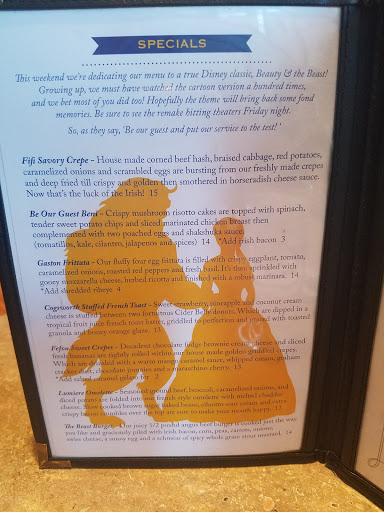 Very unimpressive. Group of five, menu looked promising, servers were very friendly and attentive. The whole thing just looked so great; our expectations were pretty high at this point (we read the reviews), and then the food came. My father and I ordered specials, both awful. Caramelized onions do not snap when you bit into them, there should be no overpowering onion taste. I had some savory crepe special, VERY bland. It had an Asian spin on it, but it was underseasoned. Flash thawed, underseasoned vegetables wrapped into a crepe with bland chicken and they forgot the peanut sauce. There was some cucumber wasabi on top but it just did not do well as it was the only thing with any taste. Mouthfuls of bland mush with wasabi, very bad. On the bright side, pancakes and custom omelette were good, but I can make those at home.
